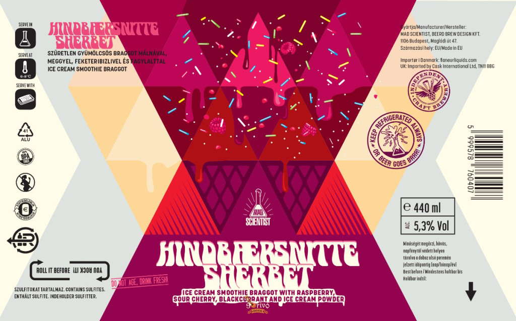 A skandináv cukrászat egyik legkedvesebb desszertje, a málnás hindbærsnitte sütemény életre kel egy pohár sörben. A Mad Scientist ezúttal egy olyan Ice Cream Smoothie Sour-t álmodtak meg, ami nemcsak ital, hanem élmény: málna, meggy és fekete ribizli káprázatos háromszöge, tejporos krémességgel turbózva. Ez a sör az a ritka pillanat, amikor a gyerekkorod kedvenc fagyija találkozik a felnőtt ízlésvilágod kalandvágyával.